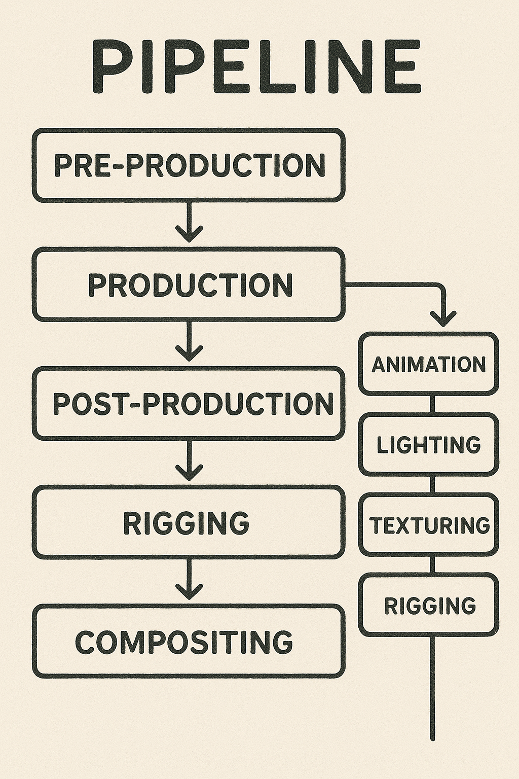 The animation pipeline refers to the workflow or sequence of stages that animation studios follow to produce an animated project. Much like a factory assembly line, each stage focuses on a specific task, handled by specialized teams, and all phases connect to deliver the final product.The pipeline can vary depending on whether it’s 2D animation, 3D animation, or game animation, but the fundamental stages remain similar.
